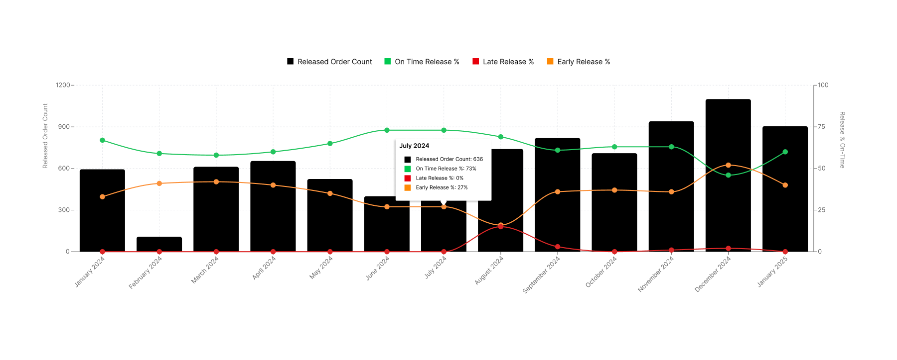 Built-in BI Dashboards give planners and operations managers instant visibility into Cycle Time Variance, Order Release Adherence, CONLOAD™ Adherence, and On Time to Due Date so they can understand performance to the schedule and alignment between the model and their operations.​